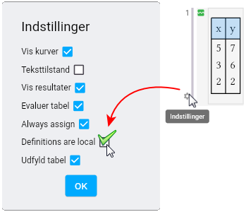 Maple Learn arbejder med globale variable, så alt hvad du definerer ét sted, gælder i hele dokumentet. Løsningen er at erklære variablen local, således at variablen kun gælder den aktuelle ‘matematik-gruppe’ . Dette gøres ved at klikke på tandhjulet ved siden af matematikgruppen og afklikke ‘Definitions are local’.